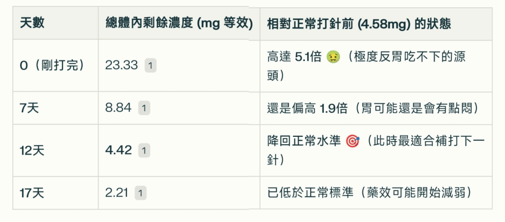 補打時機:因為算出來要12天才會降回原本第7天的低谷濃度,所以我決定延後,等將近兩週後再恢復打我的7.5mg,避免新舊藥物濃度疊加導致副作用連環爆。