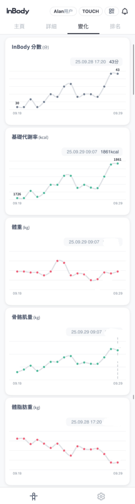 對了,9/19收到InBody Dial H40之後,體重就停滯了,而且InBody算體脂率,比Omron HBF-222T高很多、同時間量的體重也比較重(其實InBody連續兩次量,體重也會有點不一樣…😑),所以,心情更鬱悶了…